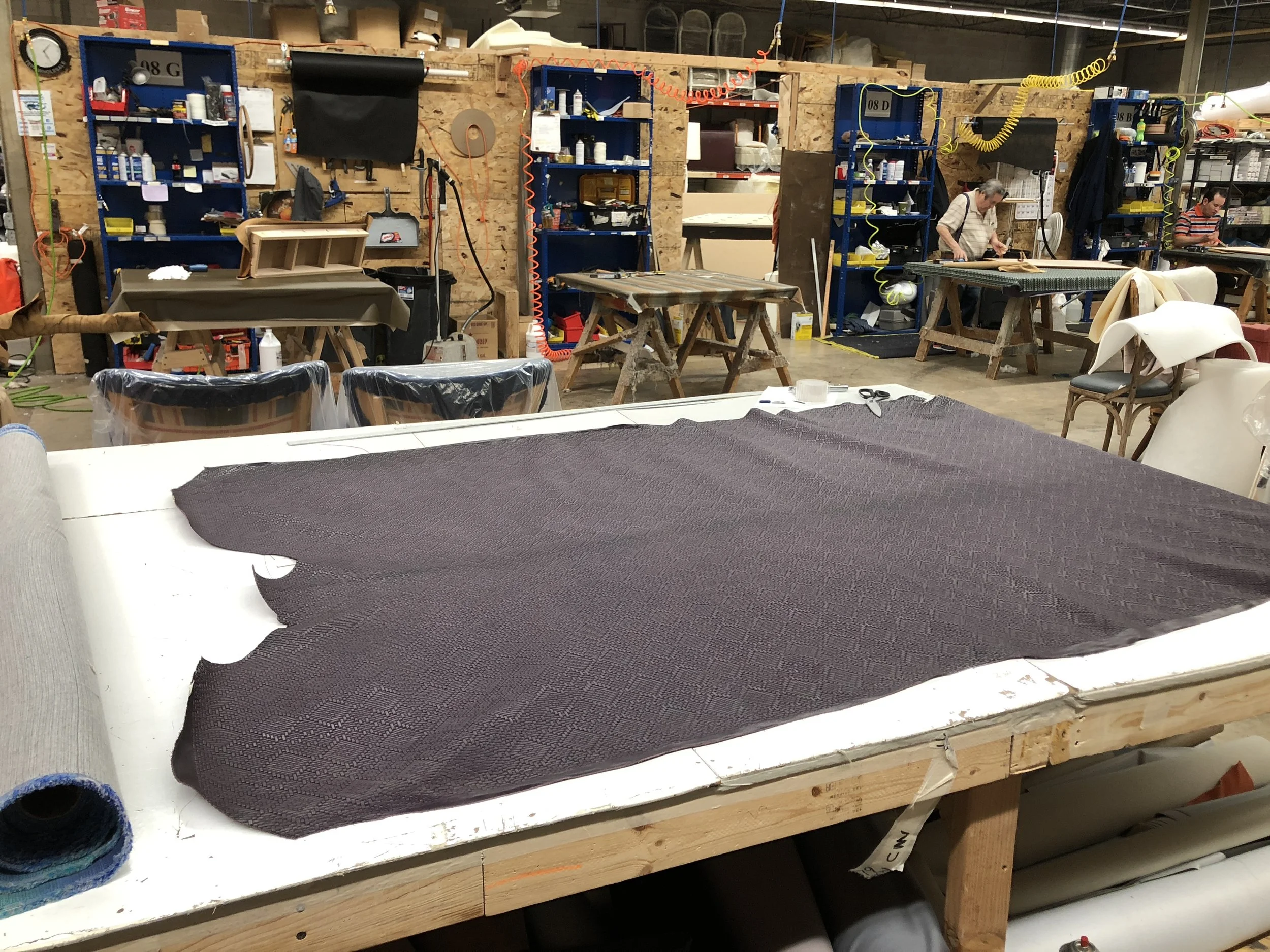 Now comes the moment we’ve been all been waiting for, rolling out the new leather! Over the past 2 month we’ve been looking at small samples and have yet to see the full hide of our new leather. When the hide arrived, I went over to Covers Unlimited to inspect it and talk with Susan about how we would lay out the pattern on the chairs, making sure to be conscious of plate lines and repeats.